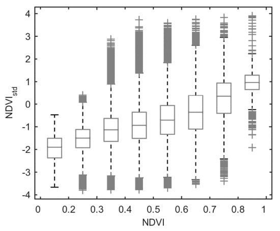 The monthly time series of NDVI for the month of June was then standardized, as shown in Equation (2), where is the standardized NDVI, is the monthly NDVI value, is the mean value of the monthly time series, and is the standard deviation of the monthly time series.