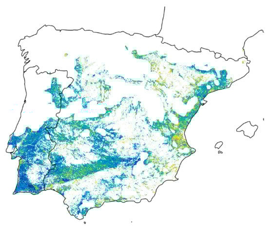 Nonetheless, and similarly to Barron et al. (2014) [40], the NDVI value at the end of the dry season was taken into account, which led to the exclusion of pixels showing a median value lower than 0.3 in the month of August. This exclusion amounts to the criterion of the seasonal variability, since it is discarding vegetation that presents a decreased photosynthetic activity on the dry season, compared to the wet season. This type of vegetation is common in the study area, as in other Mediterranean regions [22,46], due to the dryness of the summers.
