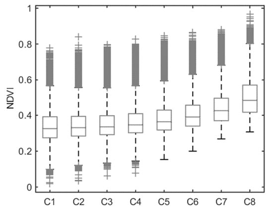 Figure 5 presents a boxplot of NDVI values for the pixels included in each cluster. Similar to the relation between NDVI and NDVIstd, the median NDVI values increased from C1 to C8, with median values ranging from 0.33 to 0.48. The median NDVI value increase is steeper from C5 to C8. These low median values are probably due to the negative impact of the extreme drought on vegetation photosynthetical activity, also highlighted by the strong NDVI decrease reported by Gouveia et al. (2012) [43]. However, the small difference in the range of values along the clusters is indicative of a diversity of responses of the vegetation to drought, since each cluster represents different magnitudes of NDVI anomalies. Besides, outliers corresponding to high values of NDVI occurred in all clusters, whereas outliers associated with low NDVI values only occurred in clusters C1 to C4, which are considered less likely to be GDV.