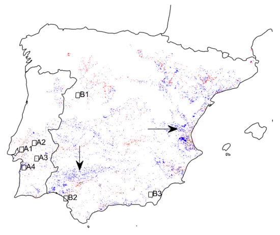 Areas identified as C7 or C8 and where WTD is lower than (red) and higher than (blue) 20 m. The arrows point to two regions of high altitude where WTD is higher than 20 m: Sierra Morena, in the South, and the province of Valencia, in the East. The boxes correspond to the Locations listed in Table 2. The labels of the boxes are also listed in Table 2.