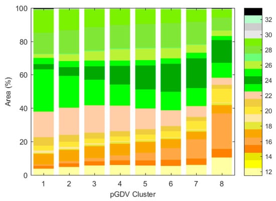 The results of the cluster analysis are shown in Figure 4, while the centroids and the area occupied by each cluster are presented in Table 3. The centroids ranged from −2.65 to 1.04. Based on the hypothesis that pGDV shows higher values of NDVIstd, we assumed that the probability of a cluster representing pGDV increases with the value of its centroid. The results shown in Figure 4 are similar to those shown in Figure 2b. Therefore, it is possible to spot the clusters identified as highly likely to be pGDV in areas that present higher NDVIstd values, and clusters not likely to be pGDV in areas that present lower NDVIstd values.
