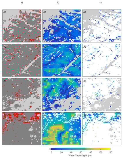 Since GDV is known to occur in the regions A1 to A4, we wanted to analyze in more detail the results obtained with the NDVIstd cluster classification. We show in Figure 8a the pixels in these regions classified as C7 or C8 (with positive centroids) in red, and the pixels classified as C1 to C6 (with negative centroids) in dark gray. The WTD is also shown, for the pixels identified as C1 to C6 (Figure 8b) and for the pixels identified as C7 and C8 (Figure 8c). C7 and C8 pixels occur in all four of the regions where GDV has been previously identified (using in situ methods) [4,6,7,12,13,14], pointing to a good performance of SRS-pGDV. The corresponding maximum, median, and minimum WTD values are shown in Table 6. The region where the WTD is deeper is A4, and on the others, the median WTD is lower (A1) or very close to 20 m, pointing to a higher likelihood of GDV occurrence. Nonetheless, it is clear on Figure 8 that pixels with a deeper WTD were consistently removed when showing C7 or C8 pixels only, as is best illustrated in the region A4. This result meets the necessary condition of groundwater availability to the occurrence of GDV. The maximum and median WTD values on C7 and C8, when compared to C1 to C6, are in agreement with the results shown in Table 5.
