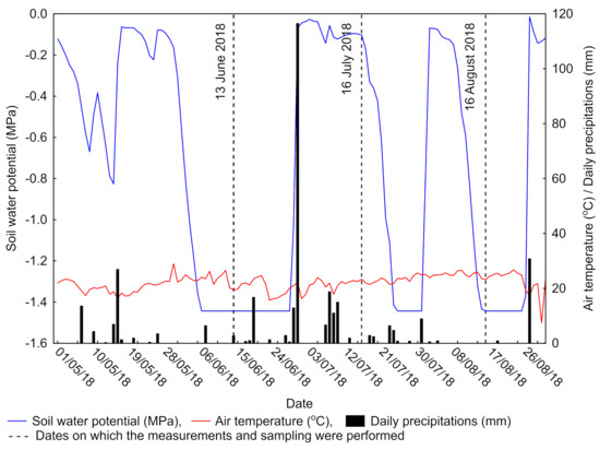 According to the obtained data during the growing season of 2018, three severe drought periods were characterised by low precipitation, soil water potentials of −1.5 MPa and air temperatures around 30 °C: the first starting in May and lasting for twenty-nine days (from 28 May 2018 till 25 June 2018), the second in July lasting for ten days (from 21 July 2018 till 30 July 2018) and a third in August lasting for sixteen days (from 9 August 2018 till 25 August 2018) (Figure 1).