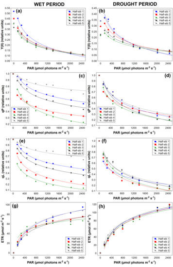 Chlorophyll a fluorescence parameters generated by rapid light curve’s (RLCs) as a function of photosynthetically active radiation (PAR, µmol photons m−2 s−1) applied to leaves of five Q. robur half-sib lines during wet and drought periods. (a,b) Effective quantum yield (efficiency) of PS II photochemistry (Y(II), relative units), (c,d) coefficient of photochemical quenching (qP, relative units), (e,f) coefficient of photochemical fluorescence quenching assuming interconnected PS II antennae (qL, relative units), (g,h) electron transport rate (ETR, μmol m−2 s−1).