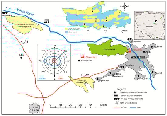 Location of Kampinoski National Park (KNP, area marked in green) in relation to the important spatial elements that may affect the park. In the upper right corner, the location of the KNP is marked against the background of the map of Poland. In the upper middle, a map of KNP is shown with the location of research plots (black spots) against the background of geological formations (yellow, aeolian sands; blue, alluvial deposits). Red icons on the main image indicate the most important possible sources of heavy metal emissions (chemical fiber plant in Chodaków on the left and smelter plant in Warsaw on the right).