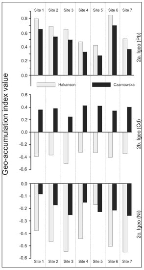Geo-accumulation indices for the particular heavy metals throughout Kampinoski National Park (7 sites, Figure 1).