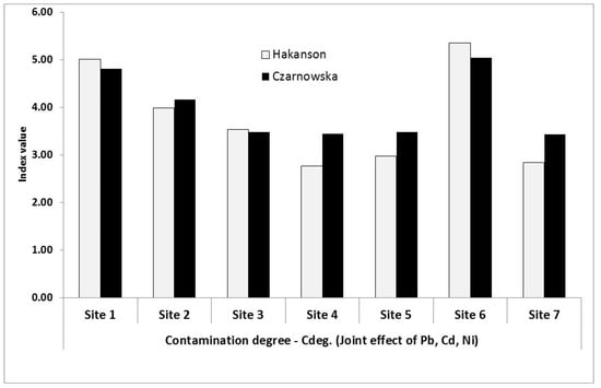 The environmental response to the impacts of trace metals and heavy metals, among others, is generally driven by the complex nature of the metals. Therefore, the use of indices such as degree of contamination () for a global evaluation of the site should more accurately depict the situation than considering metals individually. We considered the range < 7, indicating a low degree of contamination. None of the calculated indices exceeded this threshold, and mean values were 3.78 and 3.98 established from the Håkanson and Czarnowska background values, respectively. We found that Pb could be identified as a discrete contamination-driven metal, since it contributed over 50% of the overall park contamination (Table 7).