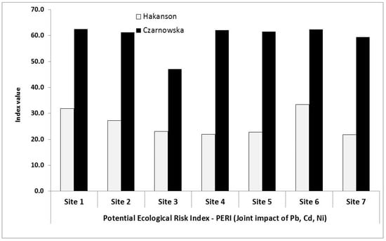The ERI mean values varied with heavy metal contents on-site as well as the background values used for calculating the indices. A larger range was observed for the Czarnowska values, 1.28 to 47.52, as compared to the narrower range using Håkanson’s values of 2.50 to 4.96. Two metals were identified as significantly involved in shaping the ERIs: Pb and Cd. For lead and cadmium, their values in both cases were within the range of 10.68 to 14.96 (grade: considerable risk) and 8.55 to 47.52 (grade: moderate to very high risk), respectively. The consideration of the toxicity response factor (Tr) identified some specific metal features, which were more highly magnified for Cd (Tr = 30).