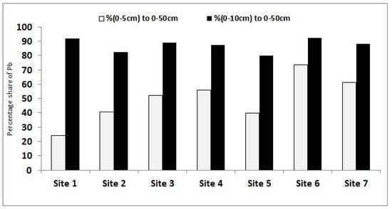 Percentage share of Pb from the 5–0 (litter) and −5 to −10 cm layers in the whole (5 to –50 cm) sampling depth.