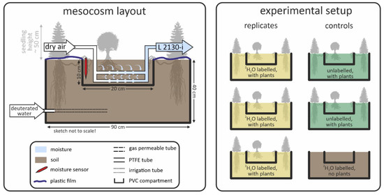 Six mesocosms, each comprising 2 nested polyvinylchloride (PVC) compartments (dimensions of inner and outer compartment: length × width × height = 90 × 38 × 40 cm³ and 20 × 20 × 10 cm³, respectively) were set up as shown in Figure 1 and Figure 2. Soil for the mesocosms was collected in autumn 2015 in the Black Forest close to Emmendingen (SW Germany). The material was taken from the Ah horizon of a Dystric Cambisol that originated from Triassic sandstone and showed a sandy loam texture (see [67] for site and soil details). The soil material was mixed with perlite at a volume ratio of 1:1. Perlite is a highly porous mineral that improves soil drainage and aeration properties while retaining moisture. These properties helped with the homogenization of soil moisture and isotope equilibration.