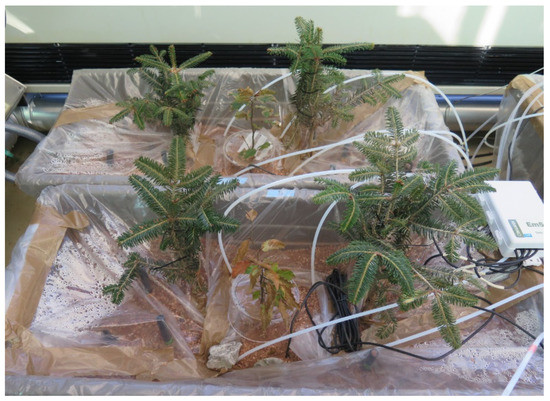 We used a membrane-inlet water-vapor sampling technique in soil coupled to a cavity ringdown laser spectrometer [71,72] to trace 2H2O transport from the fir to the beech compartment. For this purpose, the beech compartment of each mesocosm was equipped with gas-permeable tubing (Accurel PP V8/2HF polypropylene tubing, Membrana GmbH, Germany: 30 cm long sections buried at 5 and 10 cm depth) that was flushed with synthetic dry air (20% O2 in N2) during measurements (Figure 2). The dry air absorbed moisture upon passing the gas-permeable section. This approach resembled in situ soil air probes [72], but with double the length of gas-permeable tubes in each beech compartment. Accurel tubes are suitable for isotopic measurements, as they do not cause isotopic fractionation across a wide range of soil-moisture contents, and render possible vapor measurements in equilibrium with soil water [71].