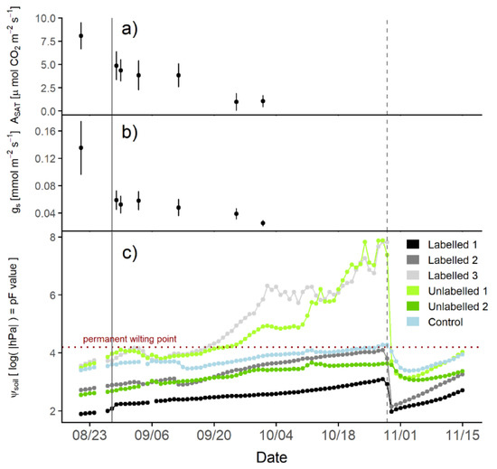 where , and Ψ is the absolute value of soil-water potential (hPa/cm water column) at a specific volumetric water content θ (cm3 cm−3). θs and θr were the saturated and residual water content of the soil, respectively. Parameters α (hPa), n, and m are shape parameters. For fitting, θs and θr were determined from measurements, and α and n were estimated using the soil texture of the potting substrate (sandy loam texture) according to Hodnett et al. [69]. For calculation, we used gravimetrically calibrated volumetric soil moisture. We conducted predawn water potential (Ψpredawn) measurements on 2 October to validate model results. Ψpredawn was measured on beech branches using a Scholander pressure chamber [70] (Model 1000 Pressure Chamber Instrument, PMS Instrument Company, Albany, Oregon, USA). Plant Ψpredawn could be used as an estimate for soil Ψ on the basis of the assumption that plant Ψpredawn was in equilibrium with soil Ψ adjacent to roots. Water potential is expressed as pF values, which is the logarithm of the absolute values of Ψ (hPa). Due to potential biases inherent to VWC measurements at very dry soil conditions, pF calculation can be subject to large uncertainty leading to pF values above the physical limit of ~6.9.