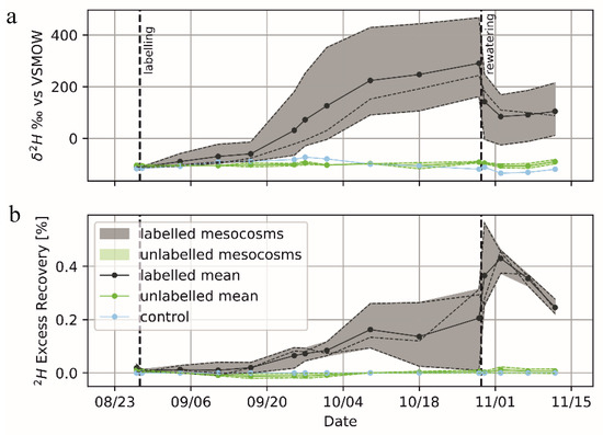 (a) Time series of δ2H in soil moisture in beech compartment of 2H-labeled mesocosms (grey), planted unlabelled mesocosms (green), and labelled control mesocosm without plants (light blue). Dashed lines: time series of each respective replicate; solid lines: their mean values. Re-watering was with unlabelled water. (b) Time series of 2H excess recovery in beech compartments expressed as percentage of 2H excess added by deuterated water to fir compartment. Isotopic composition of control mesocosms’ beech compartment used as baseline for excess calculation. Grid was spaced at 14 day intervals.