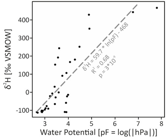 Relationship between δ2H and pF values in beech compartments of labelled mesocosms. Only incubation period from labelling until re-watering was considered.