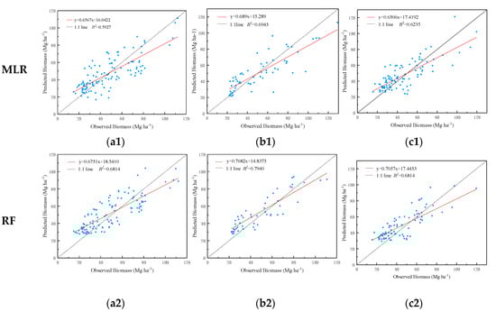 Graphs of the predicted versus observed values of three forest types for two models. (a1) and (a2) Coniferous forest; (b1) and (b2) Mixed forest; (c1) and (c2): Broadleaf forest.