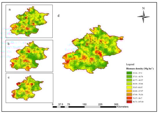 Because the data set used in this research did not contain all sample plot data from the forest inventory in Beijing, it can represent the distribution but not the total amount of biomass, while biomass density can represent the state of forest resources in Beijing well []. The 2016 forest biomass density range of Beijing was estimated by this model to be 19.14–195.66 Mg ha−1, and the average biomass density was 52.26 Mg ha−1. The forest biomass density in Beijing increased compared with previous studies [].