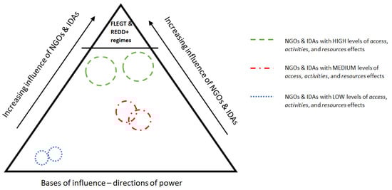 A map of Nongovernmental Organizations (NGOS) and International Development Agencies (IDAs) capability to influence Forest Law Enforcement, Governance and Trade agreement (FLEGT) and Reducing Emissions from Deforestation and Forest Degradation (REDD+) regimes outcomes. Source: Author’s elaboration. Note: The more the activities, access opportunities, and availability of resources, the more an NGO or IDA can influence FLEGT and REDD+ regimes outcomes. The size and level of a circle are, therefore, determined by the nature and amount of activities, access opportunities, and resource availability.