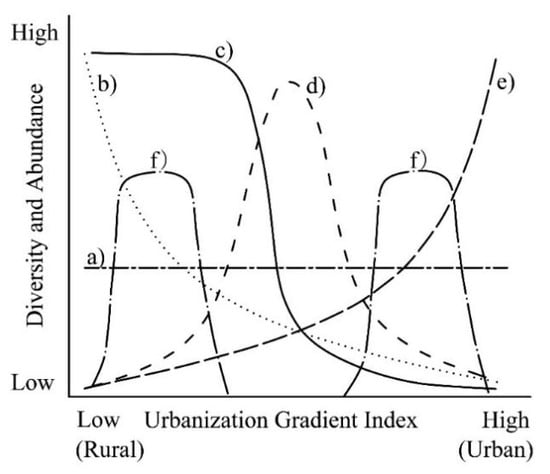 Responses of organisms to urbanization gradient. (a) no response, (b) negative response, (c) punctuated response, (d) intermediate response, (e) positive response, and (f) bimodal responses (Redraw from McDonnell & Hahs [26]).