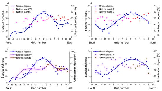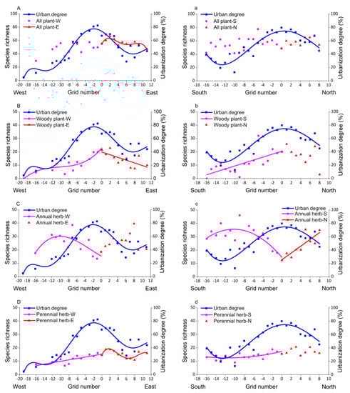 For easy comparison, polynomial curve fitting was utilized to quantify the spatial distribution patterns of plant species of different taxa along the urban–rural gradient. Urbanization degree showed approximately a symmetric pattern along the west–east and the south–north urban-rural transects where the urbanization degree peaked in the urban center and decreased gradually from urban to rural areas, except for a little valley near the east and south rural end, respectively (Figure 4).
