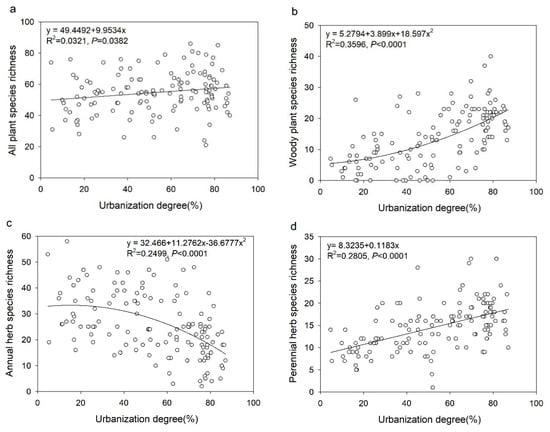 Urbanization could influence plant diversity, such as reduce native plant species richness, increase exotic plant species richness, structural and functional alteration [83,84,85,86], etc. at local, regional and global scales [87,88], ultimately leading to biota homogenization [25,89,90,91]. This study showed how the urbanization degree influences plant diversity of different taxon. It is very necessary and important to understand the underlying process of urbanization on plant diversity, which was less well addressed before. Previous studies founded a positive linear relationship [27] and negative linear relationship between urbanization and plant diversity. We found a diversity of relationships (linear model, quadratic polynomial model, and no relationship) between urbanization and plant diversity in this study, which deeply enriches the theory of plant responses to urbanizations.