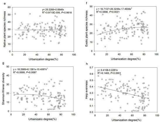 The relationship between urbanization degree and plant species richness. (a) All plants, (b) Woody plants, (c) Annual herb, (d) Perennial herb, (e) Native plant, (f) Exotic plant, (g) Shannon-Wiener diversity, (h) Heip evenness.