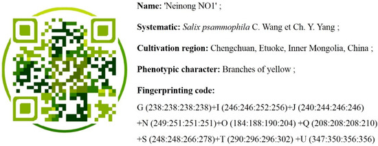 All accessions can be identified at any of the possible sets of eight core nine-marker combinations with MC2 = 100% (Table 2) from the total set of 22 markers we used in these analyses. Each S. psammophila accession was given an identifying fingerprinting profile based on name, province, phenotypic traits and unique fingerprint data of combined markers. The fingerprinting codes were converted into a two-dimensional barcode using a website (http://cli.im/). For example, S. psammophila ’Neinong NO.1’ is a new variety which is under application. It can be identified based on a set of nine-marker combinations of unique amplified fragments. The two-dimensional barcode of S. psammophila ’Neinong NO.1’ was established, and the information including accession name, region, phenotypic traits and the barcode can be scanned by computer (Figure 4). All accessions in the collection of Ordos Dalad can be linked to such two-dimensional barcodes. These barcodes can be linked to specific descriptions of accessions, stored in the library of the collection. This will help for the conservation and management of germplasm resources.