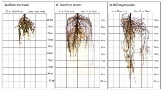 Typical root system architecture of 1-year-old Hibiscus taiwanensis (a), Macaranga tanarius (b) and Mallotus paniculatus (c) seedlings.