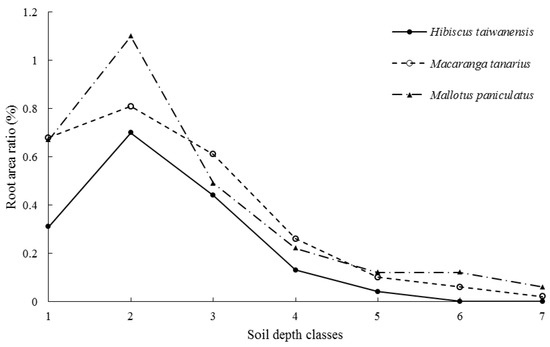 This study shows that the root systems of H. taiwanensis, M. tanarius and M. paniculatus resemble VH- (vertical and horizontal) type, which is consistent with previous studies [16,19]. Several studies showed that trees with oblique roots will reinforce better the toe slopes, whereas trees with thick tap roots can strengthen soil better in the middle of the slope [40,41]. Fan and Chen [42] indicated that the VH-type root system is beneficial for slope stabilization and wind resistance, Safuddin and Normaniza [43] demonstrated that trees with VH-type root systems are recommended for planting in the middle of the slope. Thus, H. taiwanensis with shallow roots and a shorter taproot system is suggested for planting at the toe of the slop, while M. tanarius and M. paniculatus with deeper taproots and more profuse lateral root systems are recommended for planting in the middle of the slope. Our results also showed great variations in the root spatial distribution of H. taiwanensis, M. tanarius and M. paniculatus seedlings, and a sharp decrease in root density with increasing soil depth. Furthermore, RAR (root area ratio) values varied with soil depth and species. Most roots of the three species studied were spatially concentrated in the upper soil layer. In soil with poor fertility, the root system architecture plays an important role in resource acquisition [44,45]. Several studies have demonstrated that tree root density decreased with increasing soil depth [46,47]. Wasson et al. [48] indicated that plants with deeper roots and more lateral roots have a better ability to acquire nutrients and water. Thus, it is reasonable to assume that M. tanarius and M. paniculatus are more competitive than H. taiwanensis.