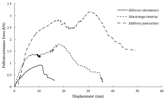 The results of pullout testing showed that M. paniculatus seedlings have the highest maximum pullout resistance, which is 1.9 and 2.9 times higher than that of M. tanarius and H. taiwanensis seedlings, respectively. Correlation analyses of pullout resistance and morphological traits reveals a strong positive correlations with root collar diameter, root biomass and taproot length. These findings are consistent with the results of previous studies [56,62,63]. In general, tree roots play a vital role in shallow slope stabilization. Edmaier et al. [64] also found that the maximum uprooting force Avena sativa and Medicago sativa seedlings increases linearly with increasing total root length following a power law, and is mainly dependent on taproot length. Burylo et al. [58] also indicated that root system with a long tap root and numerous fine lateral roots are the best to resist erosion. Moreover, Yang et al. [65] demonstrated that the root collar diameter and taproot length are the key factors contributing to tree anchorage of Pinus pinaster. Leung et al. [66] showed that trees have higher pullout resistance than shrubs, and planted trees possess higher anchorage capability than natural ones. Collectively, M. paniculatus has the highest anchorage capability among the three species examined, and is ideal for ecological rehabilitation of landslides.