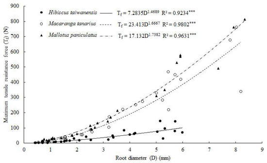 Where Pr is pullout resistance, RCD is root collar diameter, TL is taproot length, α is significance level (Table 7). Collectively, the root anchorage capability of M. paniculatus is higher than that of M. tanarius and H. taiwanensis.