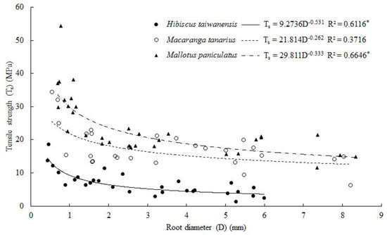 Root tensile strength is influenced as much by species as by root diameter. The relationship between root tensile strength (Ts) and diameter (d) can be expressed in the form of a simple power equation [36,38]: