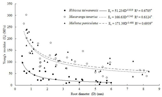Relationship between Young’s modulus and root diameter for the three species studied.