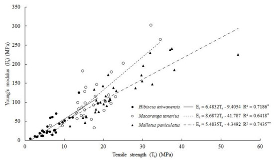 Results show the mean of Young’s moduli in roots of M. paniculatus (127.15 ± 56.8 MPa) and M. tanarius (112.6 ± 64.9 MPa) were significantly higher than that of H. taiwanensis (25.27 ± 8.35 MPa) (Table 10). Furthermore, significant differences were observed in Young’s modulus in different diameter classes among species. Young’s moduli of different root diameter classes for M. tanarius and M. paniculatus were significantly higher than that of H. taiwanensis (Table 11). Figure 6 shows that Young’s modulus decreased with root diameter in accordance with a power law function. Moreover, Young’s modulus increased with root tensile strength following a linear correlation for the three species (Figure 7).