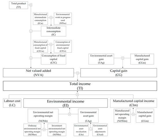 Figure 1 and the above CEA, EAr, EAg, and EAad accounting identities from the production and capital accounts provide the elements which correspond to be able to measure the environmental income (EI). The EI represents the total contribution of nature (ecosystems) to the total income (TI) of the HOW. The EI is the core variable which gives the values of the ecosystem services (ES) and the changes in the environmental assets for the period (CEA). In the case of some products, these CEA must be adjusted to avoid double counting, these CEA adjustments leading to the new variable of adjusted change in environmental net worth (CNWead) according to WPeu. Once the CNWead has been measured, the EI (5) can be presented in its ecosystem service (ES) (6) and CNWead (7) components.