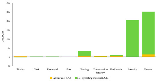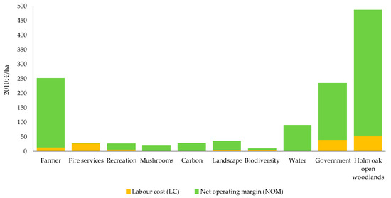 The ultimate aim guiding the accounting structure of the AAS total production account records is the measurement of the net values added (NVA) classified into ordinary (NVAo) and investment (NVAi) of the individual activities, institutional sectors of farmer and government, and whole cork oak woodlands (HOW) activities, along with the factorial distribution among the labor costs (LC), manufactured net operating margin (NOMm), and environmental net operating margin (NOMe) (Table 1, Tables S3 and S4).