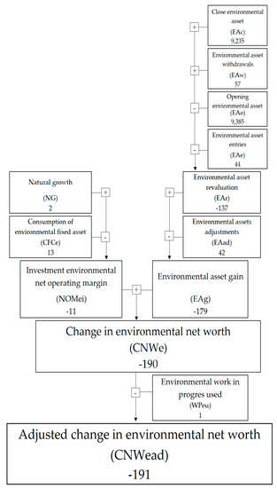The procedures for estimating the CGm and the EAg are the same. Here, we describe the EAg as it has more novel aspects of environmental asset account in the period. The environmental asset at the closing of the previous period is taken to be the same as the environmental asset at the opening (EAo) of the current period. Environmental asset entries (EAe) and withdrawals (EAw) occur during the period. Among other EAe, is that of natural growth (NG) for the period valued at environmental price discounted at the closing of the period. As regards the EAw, the work in progress used (WPeu) valued at environmental price (equivalent to environmental intermediate consumption). At the end of the period, the closing environmental asset (EAc) is estimated, discounting the indefinite flow of resource rents, assuming all else remains constant, except for the expected variations in biological productivity which are modeled in advance [17]. The revaluation of the environmental asset (EAr) is the residual variable (balancing item) in the capital account. The EAr (2) incorporates the change in the environmental asset in the period (CEA) (3)