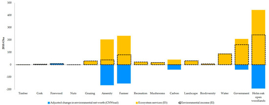 The environmental income is presented in Figure 1 and Figure S1 as the sum of the operating margin (NOMe) and environmental asset gain (EAg) components. By reorganizing the elements which integrate the NOMe and the EAg we get the identity of the environmental income (EI) which links ecosystem services (ES) and adjusted change of environmental net worth (CNWead) (Table S7 and Figure 4, Figure 5 and Figure 6). Figure 4 shows the individual and aggregate values for the AAS ecosystem services and Figure 5 shows the change in environmental net worth adjusted according to WPeu. Figure 6 shows the aggregate value of individual ES and CNWead at social prices, estimated by individual activities, farmer, government, and the HOW activities as a whole.