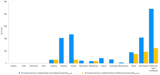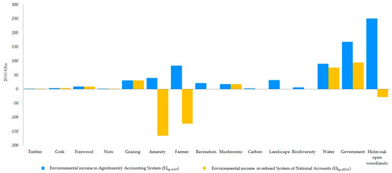 This study focuses on the comparison of the results for rSNA and AAS environmental incomes measured in the holm oak open woodlands (HOW) of the region of Andalusian-Spain (for detailed descriptions of institutional, physical and yielding characteristics of Spanish and Andalusian HOW see Supplementary Materials Text S1, Tables S1 and S2 and [18]). The rSNA net value added (NVArSNA) modified the NVASNA by uncovering natural growth (NG) and environmental work in progress used (WPeu). In the AAS and rSNA methodologies, the changes in the environmental assets are explicitly incorporated in the environmental income estimates for the economic activities valued in the Andalusian HOW, except forest carbon activity, which is omitted in the rSNA. The HOW economic activities measured using the AAS and rSNA, produce 12 and 8 environmental incomes respectively.