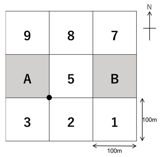 A 9-ha rectangular plot (300 m × 300 m) with two inner 1-ha subplots, A and B (Figure 2), was established during December 2012. As a starting point for establishing the 9-ha plot, the south-east corner point of subplot A was subjectively located in an area with trees marked for felling, and the base and cross lines of each subplot were laid out in north–south and east–west directions, respectively, from that point []. When we located the corner point of subplot A, we attempted to find a location representative of a production stand in which the plot included some of the trees marked for harvesting, while avoiding inaccessible areas that were too steep and/or lacked commercial species []. Intensive tree measurements were taken in subplots A and B. All the standing trees with a diameter at breast height (DBH) ≥ 10 cm were individually numbered and tagged prior to the tree felling operation, and each tree’s species was identified. Immediately after tree felling, residual trees damaged by the felled trees were assessed []. This investigation was completed in December 2012. In March 2013, when all the logging operations were completed, trees damaged as a result of the log skidding operation were traced and the number of trees removed owing to the road construction was determined. The area of the logging road was measured within the 9-ha plot.