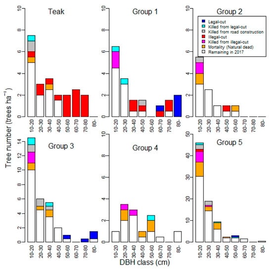 We observed the trees that were illegally cut for 5 years after the official logging operations. The amount of illegal felling was 13.5 trees ha−1 (27.5 m3 ha−1) (Table 1 and Table S1). Illegally cut trees were mainly limited to relatively large trees, as well as smaller trees cut for use in saw pits [] (Figure 3). It should also be noted that only the most economically valuable species—T. grandis (teak) and X. xylocarpa (Group I)—were mainly affected by illegal cutting (Figure 3). The number of trees that were collaterally killed as a result of felling illegally cut trees was 10.5 trees ha−1 (0.54 m3 ha−1), but the sizes of these killed trees were relatively small (Table 1 and Table S1, and Figure 3). Overall, the number of illegally cut trees and the subsequent residual trees killed during felling amounted to 24.0 trees ha−1 (28.0 m3 ha−1) being lost over the 5-year post-harvest period (Table 1 and Table S1).
