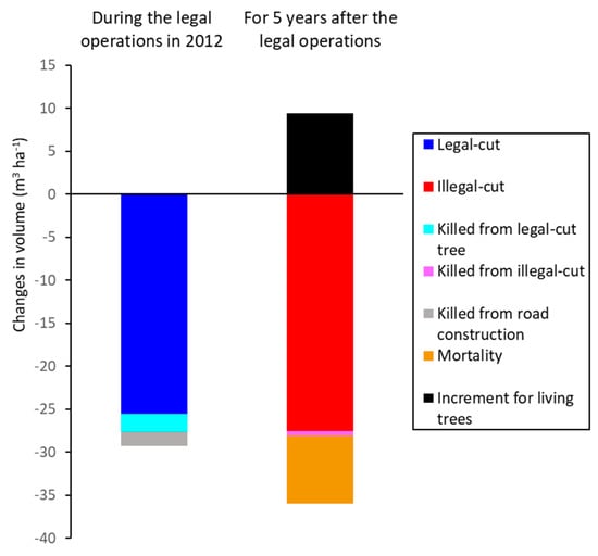 The logging intensity is a critical factor that determines residual tree damage, soil disturbance [], and biodiversity loss [] during tropical selective logging. The intensity of official logging in this study (5 trees ha−1 and 25.5 m3 ha−1) is relatively low compared with the maximum ranges reported in the tropics, such as 20 trees ha−1 [], 70 m3 ha−1 [], and 200 m3 ha−1 []. Sist et al. (1998) [] suggested that the felling intensity of reduced-impact logging must be limited to a maximum of 8 trees ha−1 to reduce logging damage by 50% in comparison with conventional logging. Therefore, the intensity of official logging in this case study may not be the main reason for forest degradation. However, the amount of illegal logging was substantial, and its volume (27.5 m3 ha−1) over the 5-year post-harvest period was similar to that of official logging. When we considered the total of human-induced disturbances, which included official road construction and collateral death caused by felling legally and illegally cut trees, the amounts of killed trees were similar between legal and illegal disturbances (29.3 and 28.0 m3 ha−1, respectively). The volume affected by illegal disturbances was considerably greater than the 5-year volume increase (1.45 m3 ha-1) resulting from natural occurrences (mortality, recruitment, and living tree growth). Using data from only 5-year measurements, we could not determine whether stocking would recover to the pre-harvest level for the 30-year cutting cycle, but it was clear that illegal disturbances are the main cause of the large reduction in stocking after official logging (Figure 4).