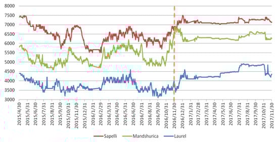 Sapelli, Mandshurica, and Laurel are the major hardwood lumber species imported by China. Sapelli is imported primarily from Africa, Mandshurica from Russia, and Laurel from Myanmar, Vietnam, and several African countries []. The import values of Mandshurica (US $291 million) and Sapelli (US $52 million) are the second-and fifth-largest among all species of hardwood lumber imported in 2016. Laurel has many subspecies, the trade indices of which are not distinguished in United Nations Comtrade. Given their superior properties, these three species are widely used to produce wooden furniture, floors, doors, and interior decorations, and they are substitutes in consumption. We obtained their price data from the China Timber Price Index Network of China’s Development and Reform Commission. The database provides daily price information on most timber trading markets in China. All price data were obtained from the Great Southwest Building Material Market in Sichuan, one of the largest timber markets in China. The daily price series were based on the price for the highest single-deal volume for that day. Freight and transportation costs were not included, and for the study period no tariff was imposed on imported lumber. The market prices of all three species, measured in Chinese yuan (CNY)/m3, were hierarchical (Figure 1). The average prices of Sapelli, Mandshurica, and Laurel over the study period were CNY6718 (US $1027)/m3, CNY5691 (US $870)/m3, and CNY4006 (US $612)/m3, respectively, reflecting their quality difference. Sapelli is of higher quality than Mandshurica and Laurel, especially in terms of weathering and crack resistance. Given the price fluctuations, we considered that a structural break might have occurred at the end of 2016. The annual average volatility (calculated using the price data) prior to December 31, 2016 was 28% for Sapelli, 34% for Mandshurica, and 49% for Laurel, thus significantly higher than 7%, 8%, and 15% calculated for 2017 for these three species, respectively. Then, we aimed to identify a structural break in the price series using the breakpoint unit root method []. The break date was around 30 November 2016, as also supported by the Chow test (Table 1). Thus, the entire sample period was split into two subperiods: the first one was from 30 April 2015 to 30 November 2016, and the second one ran from 1 December 2016 to 30 November 2017. The break date corresponds to the end of the second implementation phase of the CCLB, which is an inflection point in terms of the decline in timber harvests from China’s natural forests. The price fluctuations closely reflected the impact of the CCLB.