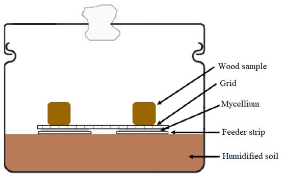 Samples from the treatments were tested to evaluate their resistance against biological attack. First, the samples were leached according to Section 2.4, then the procedures for the fungi test followed AWPA E10 []. The test was performed for 12 weeks. As AWPA E10 recommends and to obtain discriminant results, samples from SYP were subjected to brown-rot fungus (Gloeophyllum trabeum), and YP samples were exposed to white-rot fungus (Trametes versicolor). The weight loss due to fungal attack was the response variable selected to quantify the efficacy of the treatments. The following deviations from the standard were employed: for samples containing DOT, a thin, rigid, perforated grid was placed over the mycelium to prevent undesirable boron leaching when in contact with moisture from the feeder strips (Figure 1), and the blocks were added to the test only after total colonization and coverage of the feeder strip and mesh. The grid was sterilized to the same conditions recommended in AWPA E10 [].