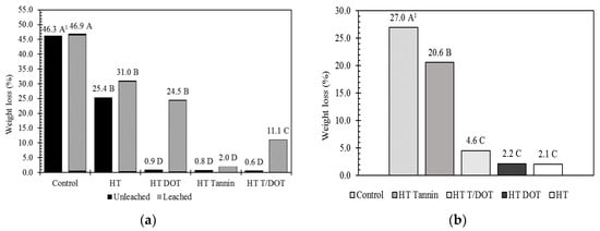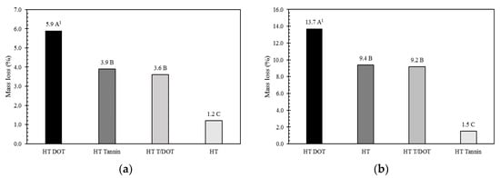 Tannins performed efficiently against brown-rot fungi for both leached and unleached treatment levels (Figure 4a). In the case of HT T/DOT, durability improvement was approximately twice as high as HT DOT after leaching. It was even better when tannins were tested alone, where the mass loss was 2% after leaching.