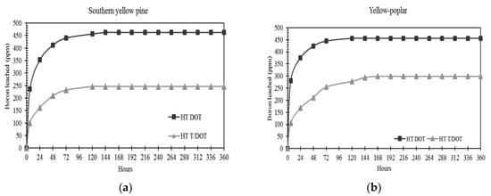 There was a steep and typical loss of boron in the early stages of the leaching [,]. The flat curve after 120 h is due to undetectable levels of boron in the leachate. The detectable threshold for boron was 4 ppm. In this case, most of the boron leaching occurred in the first five days for both treatments and species. For HT T/DOT, the leaching might have occurred due to an incomplete polymerization of the tannins []. For HT DOT, leaching might have occurred because of unfixed or poorly fixed preservatives near the wood surface [].