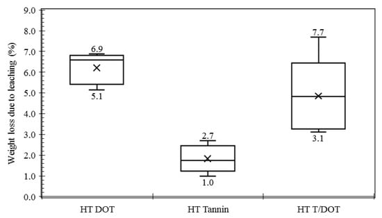 Leaching was also performed on termite samples in the same manner. For the HT Tannin treatment, weight loss due to leaching (WLleach) was calculated according to Equation (3).
