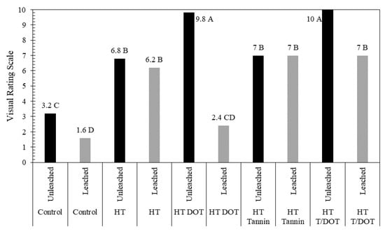 For the analysis of weight loss due to Gloeophyllum trabeum, Trametes versicolor, and termite attack, a visual rating scale was performed in an A × B factorial arrangement of treatments in a completely randomized design, where A was designed as the treatments and B was assigned as unleached and leached period. The mass loss due to heat treatment was analyzed as a completely randomized design where the sources of variation were treatment levels, namely, HT Tannin, HT, HT DOT and HT T/DOT.