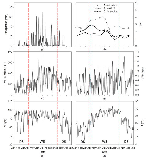 (a) Daily precipitation, (b) monthly leaf area index (LAI), daily mean values of (c) photosynthetically active radiation (PAR), (d) vapor pressure deficit (VPD), (e) relative humidity (RH) and (f) temperature (T) during dry season (DS) and wet season (WS) in 2017.