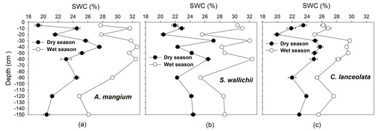 Soil water content (SWC± standard error) at 10 different depths in the dry and wet seasons at three sites. (a) A. mangium site; (b) S. wallichii site; (c) C. lanceolata site.