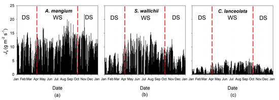 Daily mean Js averaged for all the sap flow-monitored trees in each plot during dry season (DS) and wet season (WS). (a) A. mangium site; (b) S. wallichii site; (c) C. lanceolata site.